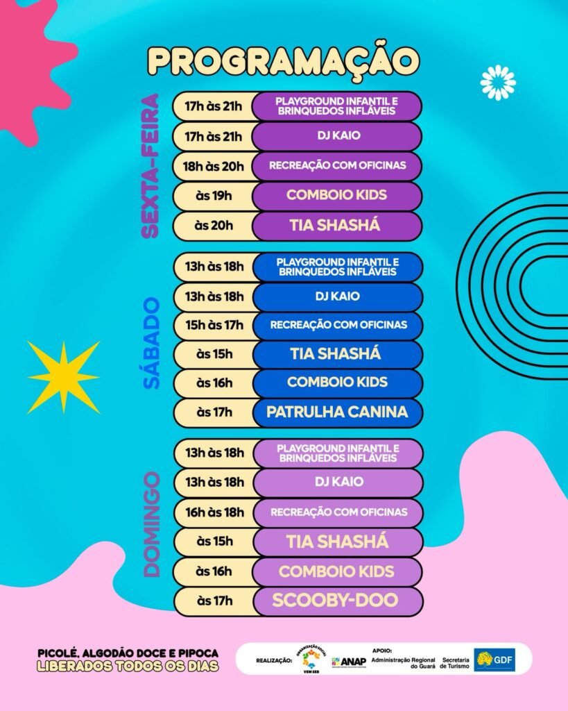 Durante os três dias de festa, o público poderá aproveitar oficinas criativas, recreação infantil, pintura facial, balão mania, espaço kids e brinquedos infláveis. Além das atividades permanentes, haverá distribuição gratuita de picolé, pipoca e algodão-doce, além de apresentações musicais. Um dos destaques será a presença de grupos infantis consagrados, como a Patrulha Canina e a Turma do Scooby-Doo.