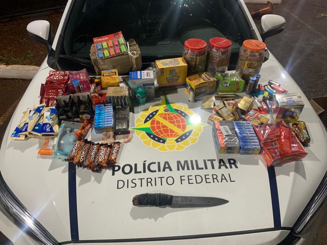 De posse das informações, a equipe iniciou patrulhamento nas proximidades e localizou um suspeito na Avenida Contorno, próximo ao 4º Batalhão de Polícia Militar. Durante a abordagem, foram encontrados em um carrinho diversos doces, chocolates, isqueiros e cigarros, compatíveis com os produtos furtados.