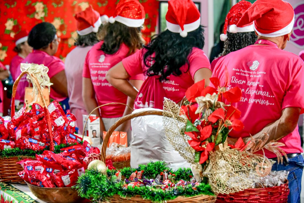 Em meio aos pisca-piscas, árvores e decorações natalinas, a Rede Feminina de Combate ao Câncer realizou, nesta quinta-feira (18), uma ação solidária voltada aos pacientes em acompanhamento no Hospital de Base do Distrito Federal (HBDF), administrado pelo Instituto de Gestão Estratégica de Saúde (IgesDF). Ao todo, foram entregues 500 cestas básicas, mil panetones, além de ovos, leite, protetor solar, kits de higiene pessoal e brindes avulsos.