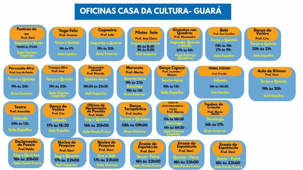 Com atividades para todas as idades, a Casa da Cultura se consolida como um espaço vivo, coletivo e aberto à comunidade. Dança, teatro, música, práticas corporais, autoconhecimento e manifestações da cultura popular fazem parte da agenda de 2026, convidando moradores do Guará e região a ocuparem o espaço, aprenderem e se expressarem.