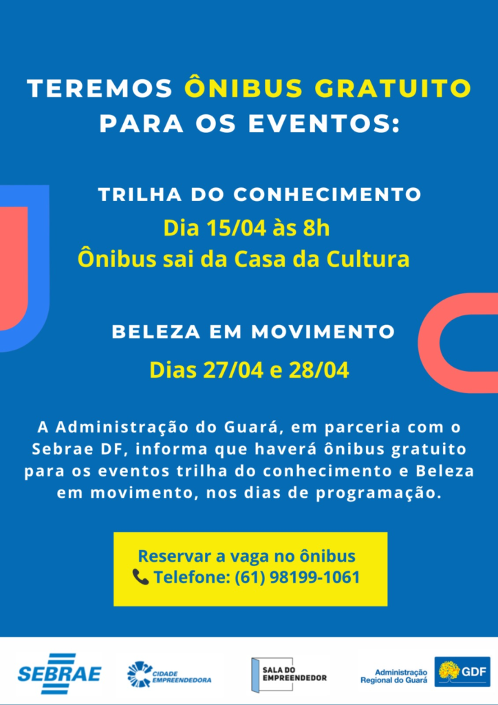 Haverá ônibus saindo das Administrações Regionais participantes para transportar os participantes. Caso tenha interesse, procure a Sala do Empreendedor da sua cidade para reservar sua vaga no transporte.
